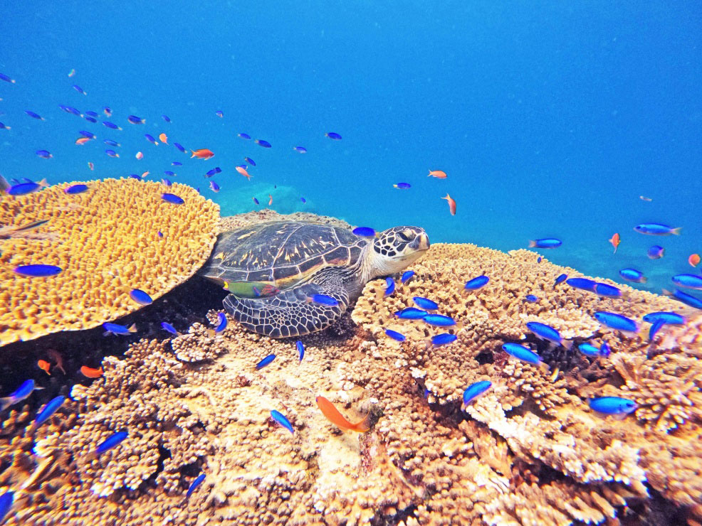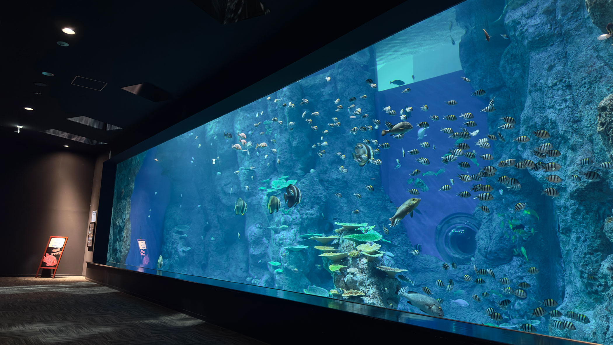 竜串の海を再現した「大水槽」は、色鮮やかなサンゴの海や、そこに息づく魚たちを観察することができます。