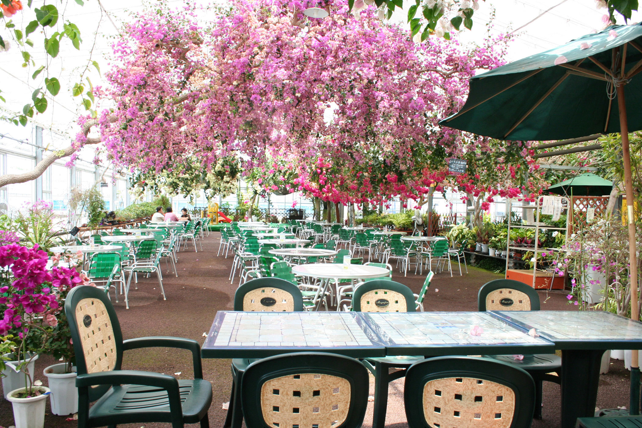 室内は天井が高く開放的な空間になっており、天井からこぼれるように咲くブーゲンビリアの甘い香りに包まれる癒しのひとときを過ごせます。