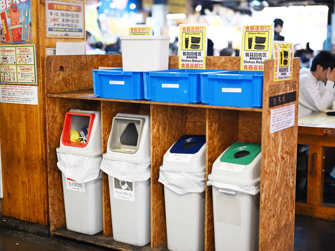 ゴミ箱や食器返却棚も複数設置されていますので、もちろん自身で片付けることも可能です。次に座る人が気持ちよく利用できるように、できる限り綺麗に利用しましょう。