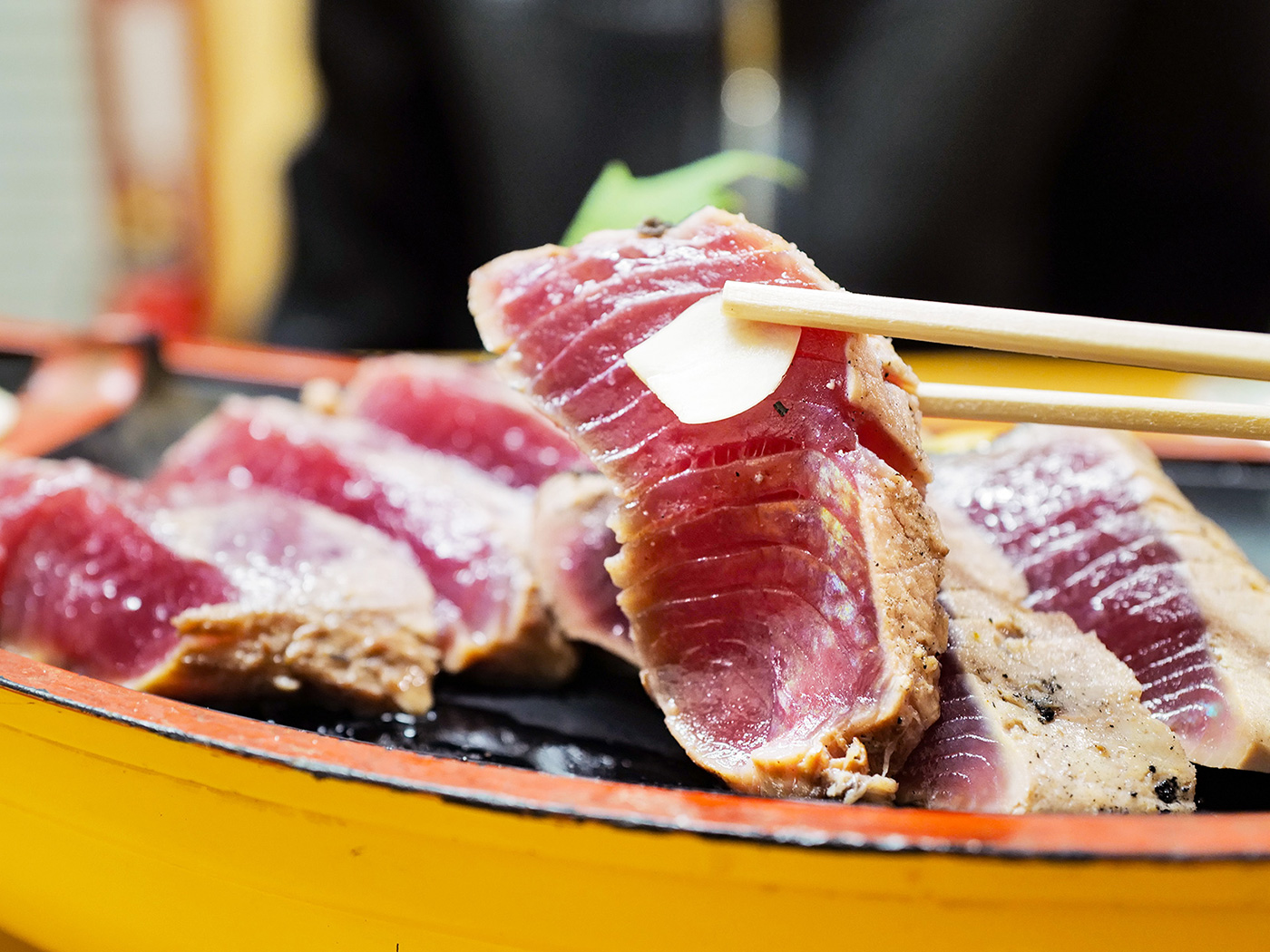 カツオの表面を藁で焼き、ニンニクや大葉、ネギ、タマネギ、ミョウガなどの薬味をたっぷり乗せて柚子の効いたポン酢醤油で食べるのが主流。近年は素材の旨みを活かすため、粗塩のみで食べる「塩たたき」も人気! 店舗により焼き方も違うので、食べ比べをして好みのお店を探してみるのも楽しみ方のひとつ。