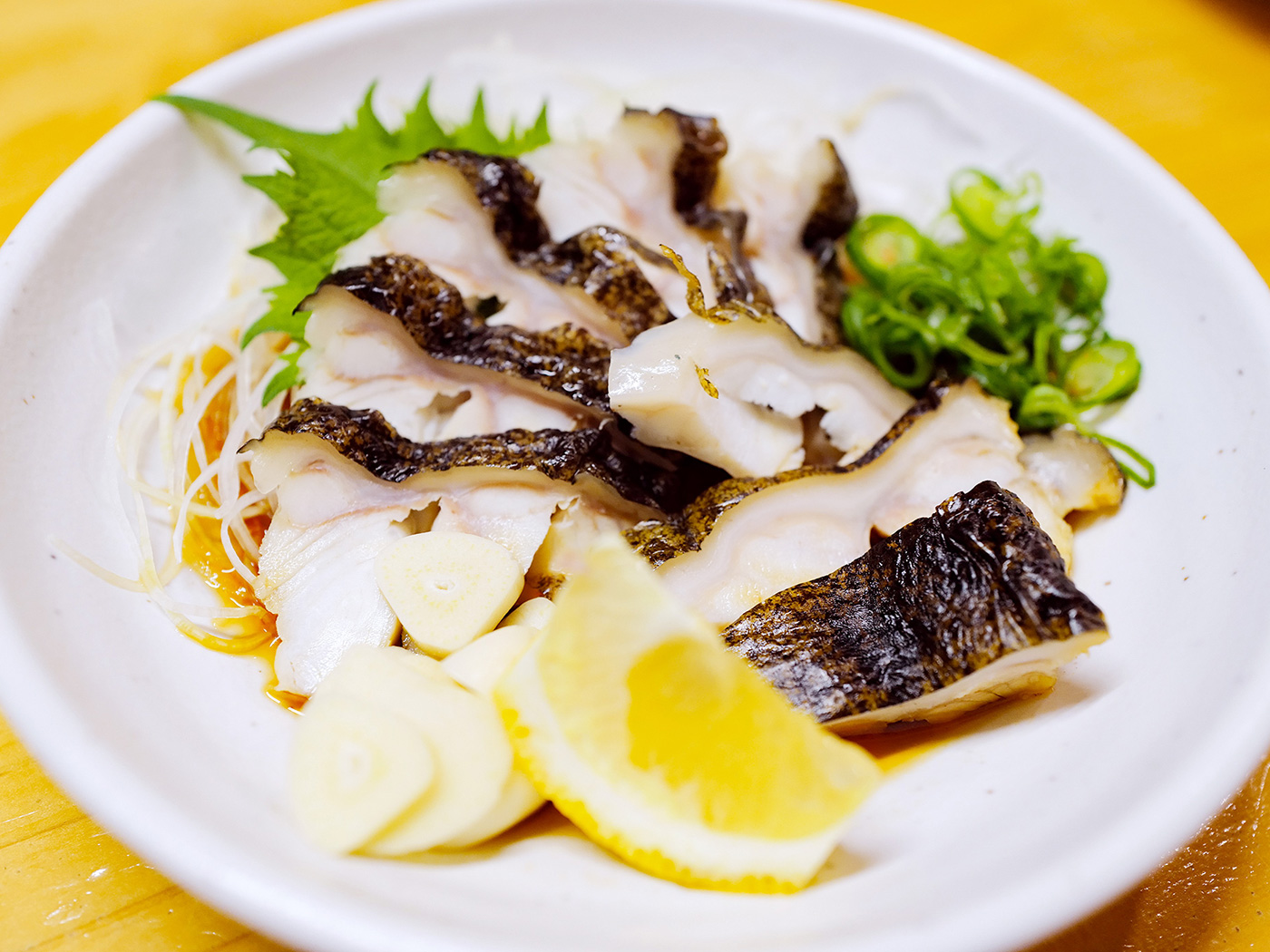コラーゲンたっぷりの皮と肉厚でもっちりとした食感の白身は、噛み応えがありクセのないあっさりとした旨味が特徴です。そこに炙りの香ばしさと多彩な薬味が加わることで、無二の味わいに。見た目の恐ろしさからは想像できない繊細な食味にきっと驚くはず。