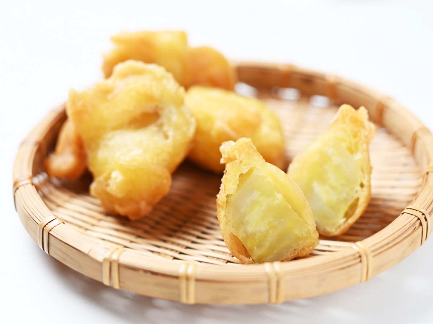 美味しさの秘密は、各店が秘伝の配合で作ったてんぷら粉にあり。衣を分厚くして揚げているので、衣だけでもやさしい甘さが楽しめます。