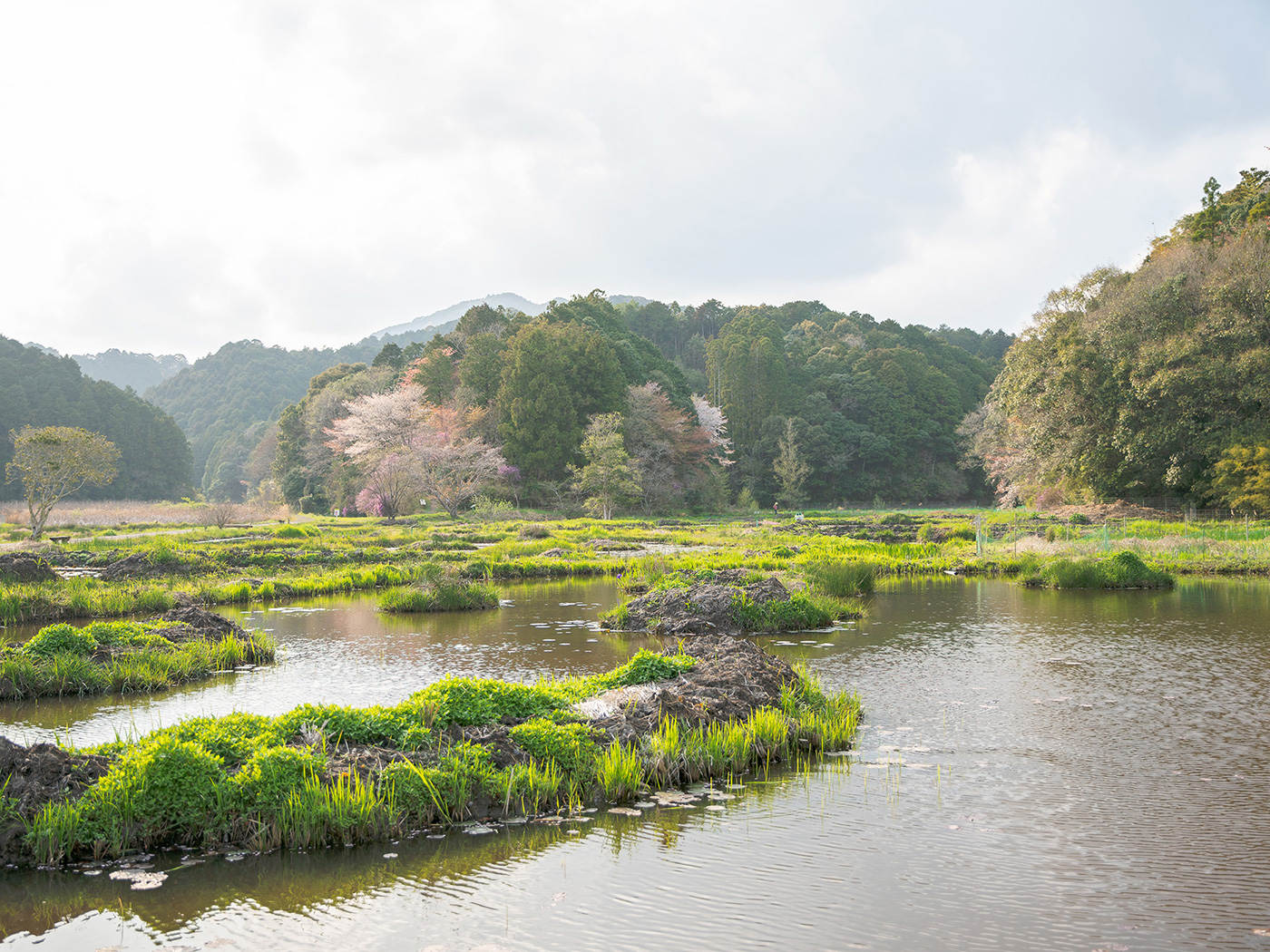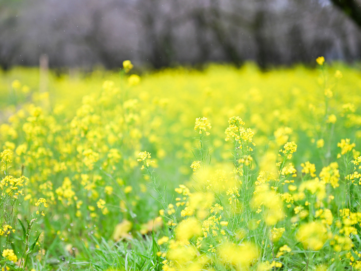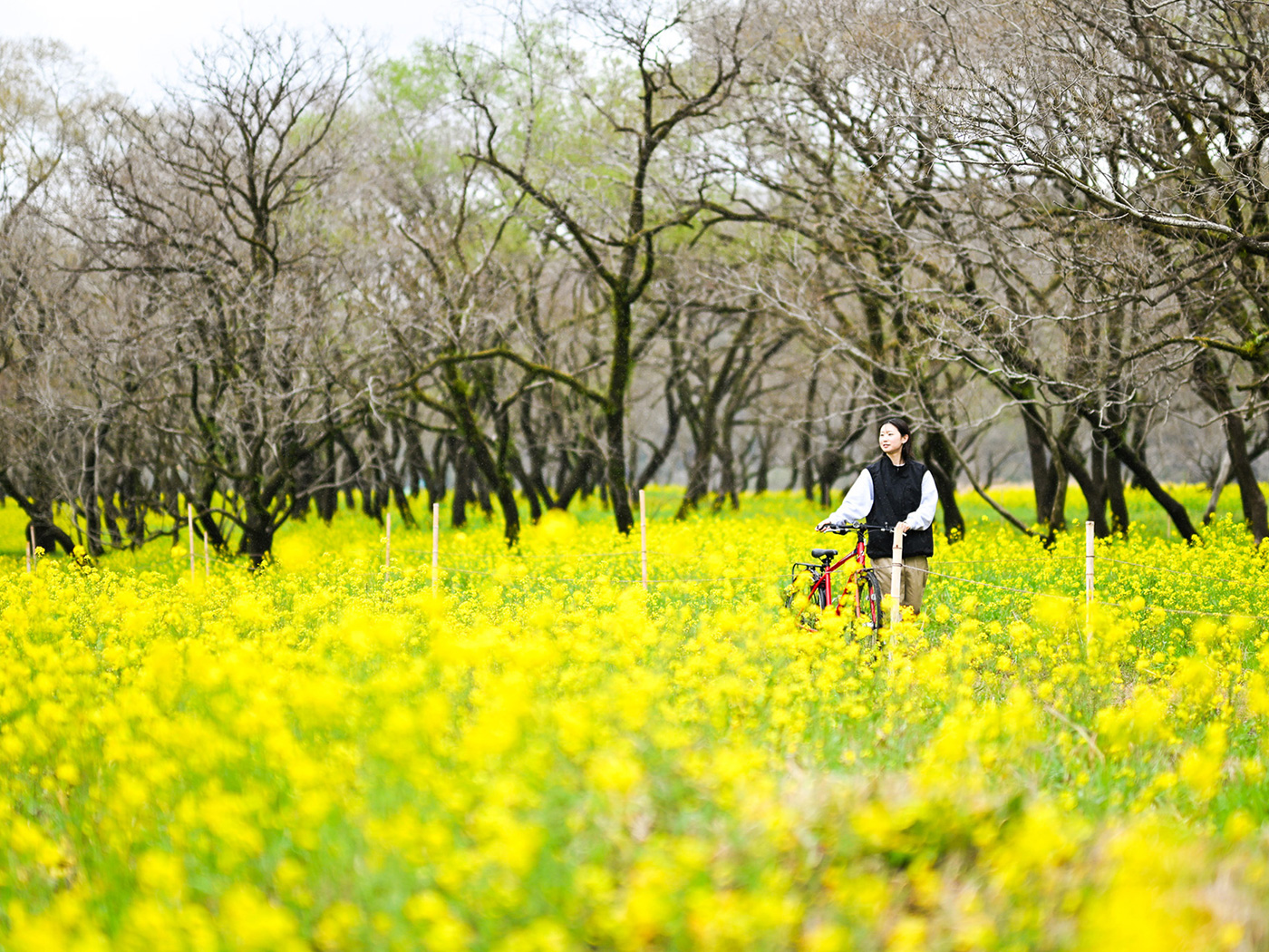 2月下旬から3月上旬ごろには菜の花の絨毯が広がり、ヤナギの柔らかな新緑と黄色い花が織りなす景色は、まるで絵画のよう。