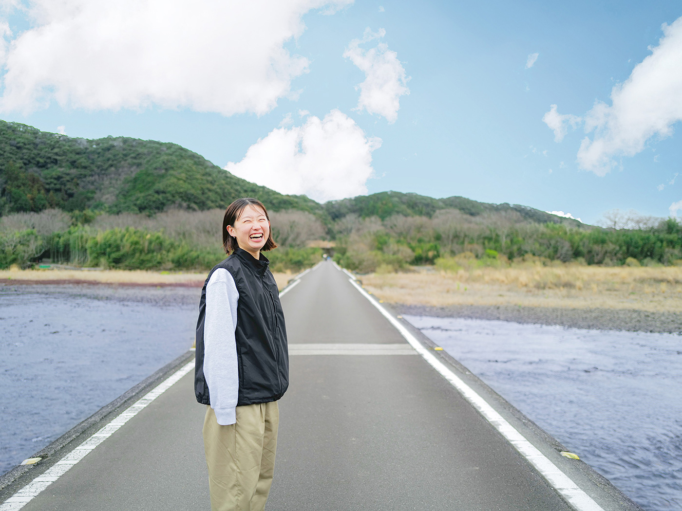 欄干のない橋に立つと、川と山の景色が目の前いっぱいに広がり、自然の真ん中に溶け込む感覚に包まれます。