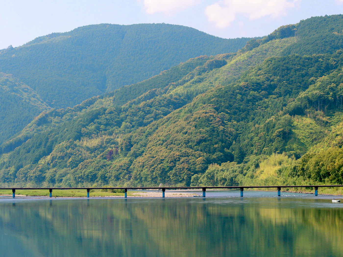 赤と青のコントラストが映える四万十川のシンボル「赤鉄橋」