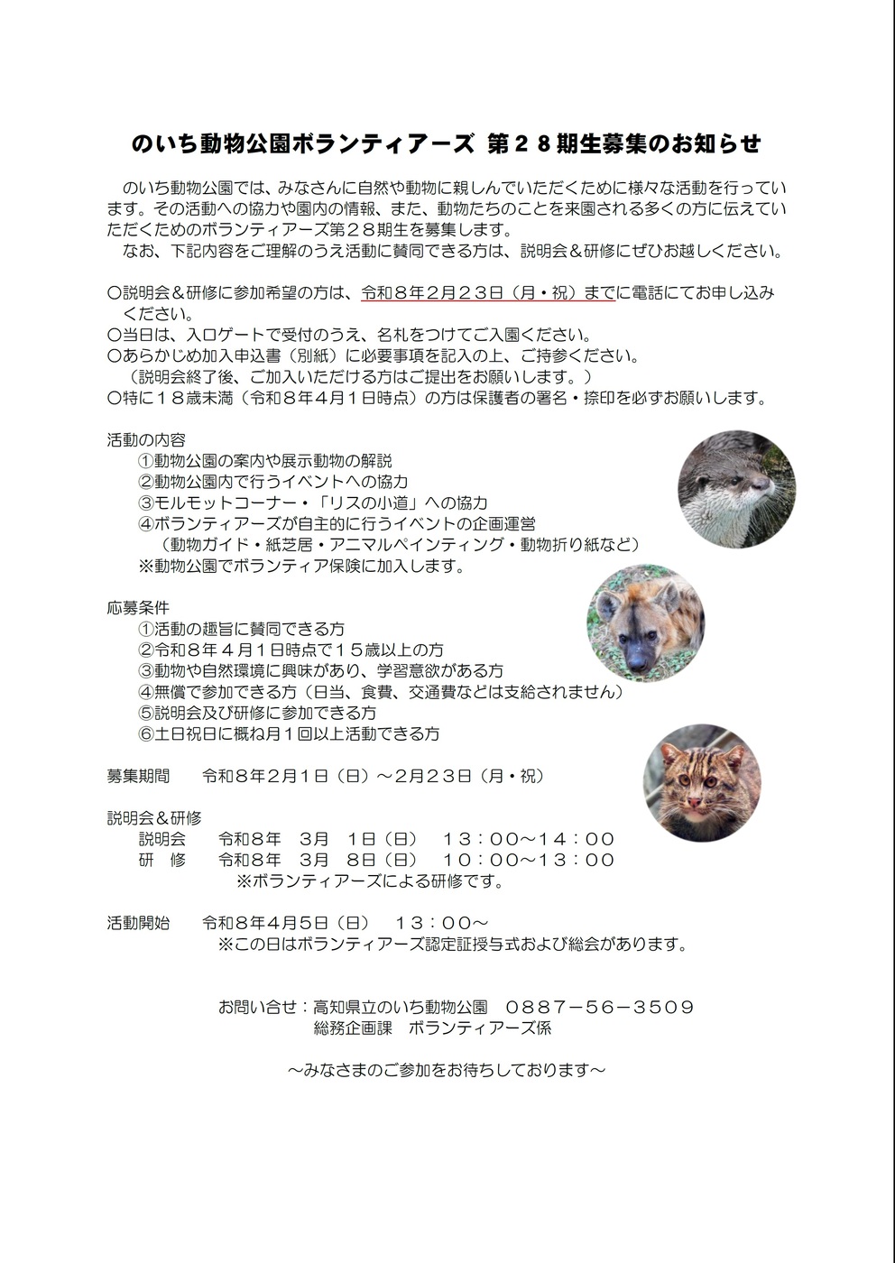 - 【のいち動物公園】のいち動物公園ボランティアーズ 第28期生募集