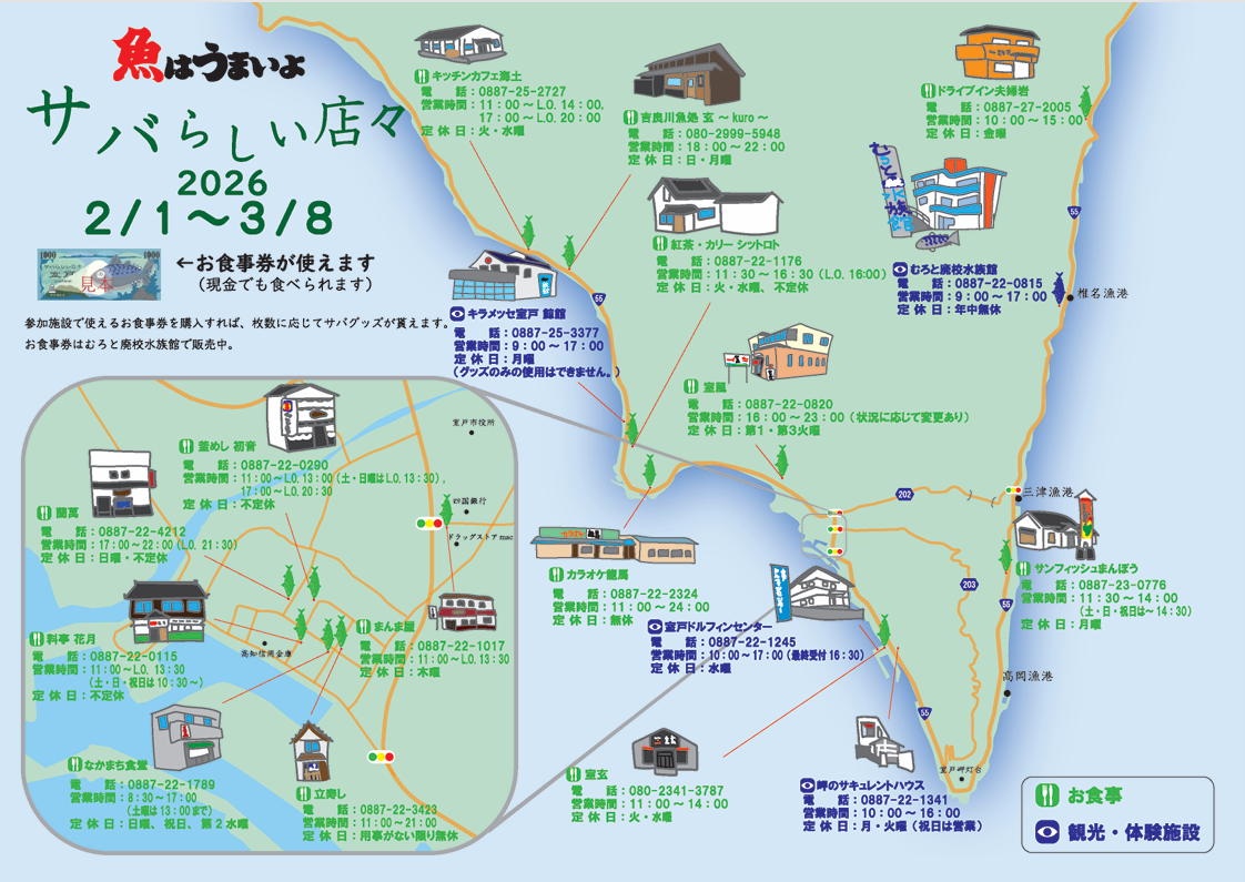 - 室戸市内の飲食店・キラメッセ室戸 ・むろと廃校水族館・室戸ドルフィンセンター・岬のサキュレントハウス(サバらしい店々のチラシをご確認ください) 室戸市